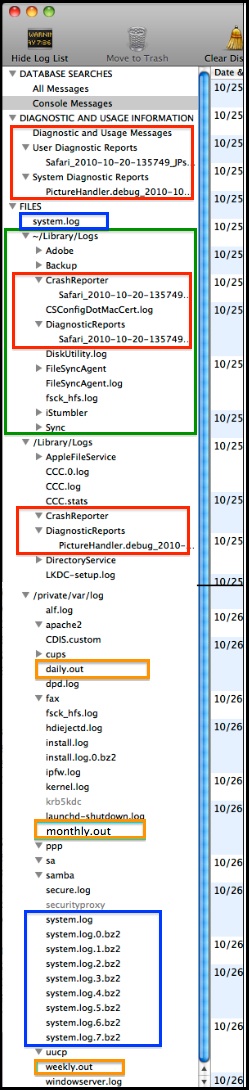 •Your system.log and/or system.log.0.bz2, etc. files (the ones with bz2 suffixes are compressed). You can safely delete any or all of them, but unless space is critical, try to leave the system.log file, at least temporarily, so you can examine it to determine what's wrong (if you do need to delete it, the system will create a new one almost immediately). You can view the logs via the Console app, in the tan box below, or just double-click it to display it. See the blue box below for help deciphering the contents.