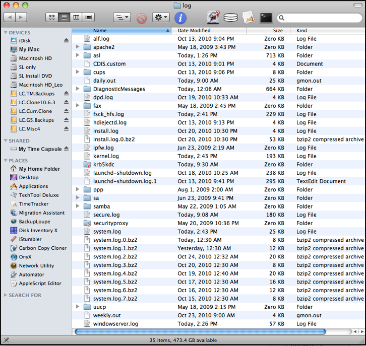 •The asl folder. Click the disclosure triangle, and you should see a series of files named by date, plus a couple of others. There should be dated files for the last week or so; if there are many more, select the old ones and delete them (you'll have to enter your Admin password), then empty the trash. That means your Mac's automatic maintenance isn't running. See OSX Maintenance Scripts. If there are a lot of files here, you may have the next problem, too: