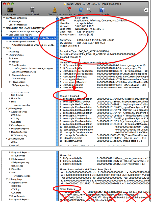 •The name of the process or app that sent the message. This may be a simple name (like iWeb and Safari towards the bottom), or a more complex one (like the Time Machine backup messages: com.apple.backupd.)