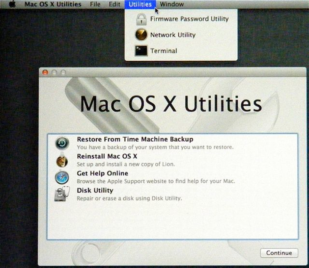 Click the Mac OS X Utilities item in the menubar and select Quit (or press Cmd-Q). You'll see this: