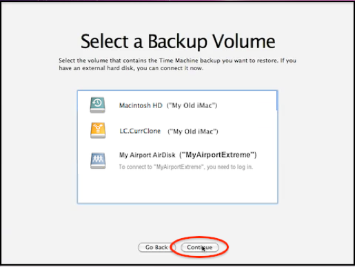•From a Time Machine backup includes those on an internal or external drive, or a network destination such as a Time Capsule. If they're on a Time Capsule, connect to it via Ethernet cable if possible. If they were made on a USB drive connected to a Time Capsule, Airport Extreme, or another Mac, connect the drive directly to your new Mac. If the backups are on an internal HD on another Mac, connect that Mac in Target Disk mode. You'll next see the Select a Backup Volume window.