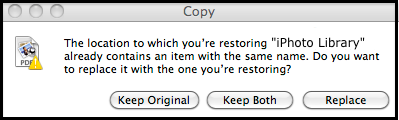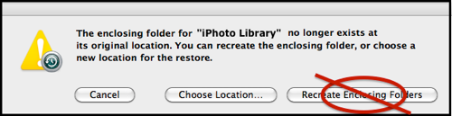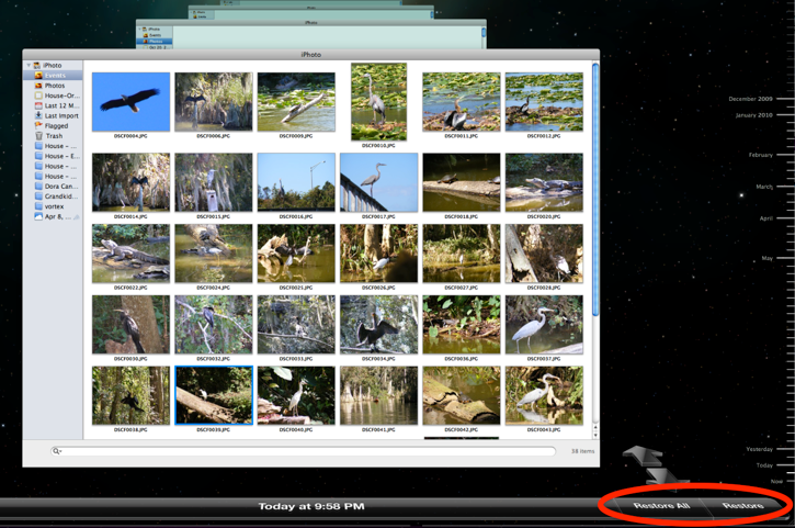 •Start with the iPhoto application, then click the Time Machine icon in your Dock, or click the TM icon in your menubar and select Enter Time Machine, or select File > Browse Backups from the iPhoto menubar.