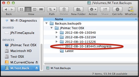 Inside that is a series of date-stamped backup folders, plus a Latest alias, plus an ".inProgress" package (looks like a file, but is actually a special type of folder) containing the remains of one or more cancelled or failed backups.