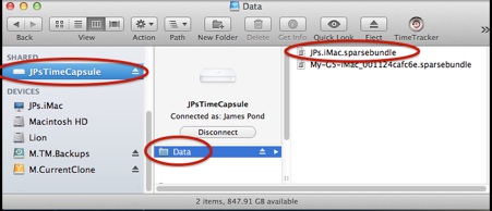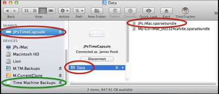 4.Double-click the sparse bundle to mount the disk image inside it (usually named Time Machine Backups, sometimes Backup of <computer name>). After a moment or two, the disk image (circled in green) should appear in the sidebar.