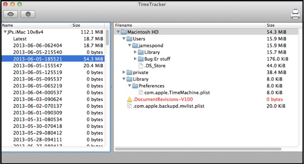 •Time Tracker is free; it’s pretty basic but usually works well. It only shows backups on the current backup destination, though, so if you've got more than one, you have to select the one you want (if you're using "rotating backups," it's the set most recently backed-up to).
