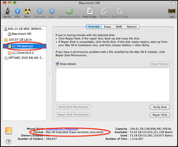 Towards the bottom, the Format should almost always be the same as your Startup drive (above), except the backups on Lion may be encrypted. If they're not the same (one is case-sensitive and the other is not), see the pink box in Frequently Asked Question #5. The only way to change the Format is to erase the partition and select a different format.