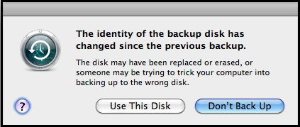 If Time Machine thinks the backup disk or network location for your backups has changed, possibly without your consent, it will send this prompt: