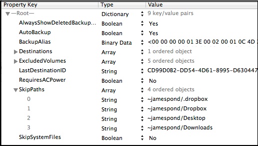 •Convert it to XML via Terminal: plutil -convert xml1 ~/Desktop/com.apple.TimeMachine.plist