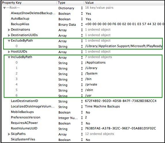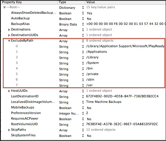 •These exclusions are "Fixed Path" exclusions, in a separate portion of the plist, that users cannot set via the Time Machine Preferences window, and are not shown there. Thus users have no idea there's a problem, as they rarely look for anything besides data in their home folders, which appear normally via the Time Machine browser.