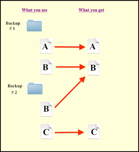 It appears there are two copies of File B, but there aren’t; each Backup Folder contains a hard link to a single copy of File B.
