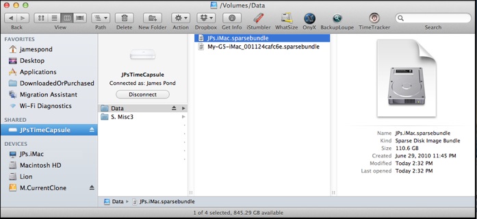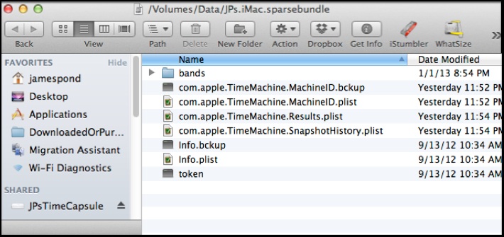 Sparse bundles, however, have that "bands" folder in the sample above. All the directories, etc., plus the data, is spread over the "band" files inside it. Only the new or changed band files are considered as changed, so they're the only ones that get backed-up. On a large disk image, that can save lots of time and backup space.